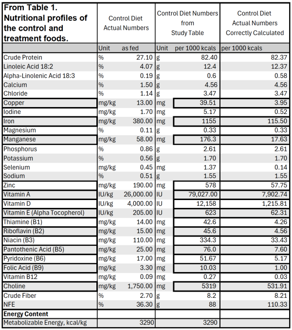 Glaring math errors in the Nutrient Table (Table 1, where nutrient levels for each diet are listed) reveal many important nutrients in the extruded kibble diet were reported significantly higher than they actually were—in some cases, 10 times higher.