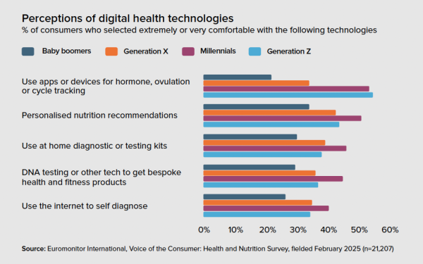 According to Euromonitor’s “Voice of the Consumer: Health and Nutrition Survey” conducted in February 2025 with more than 21,000 global consumers, nearly 40% of people surveyed reported they’re“comfortable using at-home diagnostic or testing kits.” Additionally, three in four people said they track their health with a device or mobile application.