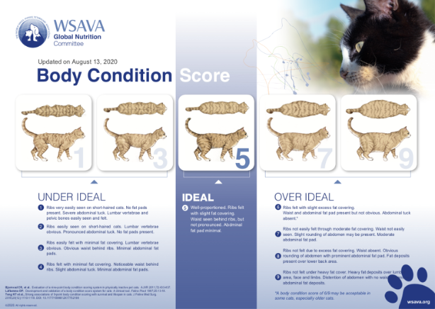 A body condition score of 4-5/9 is considered an ideal body condition. Each body condition score represents about 10% of the cat’s body weight. So, if a cat has a body condition score of 6/9 and weighs 10 lbs. then to estimate their ideal body weight, reduce their current by weight by 10%, or 1 lb., in this case. That means their estimated ideal body weight would be 9 lbs.