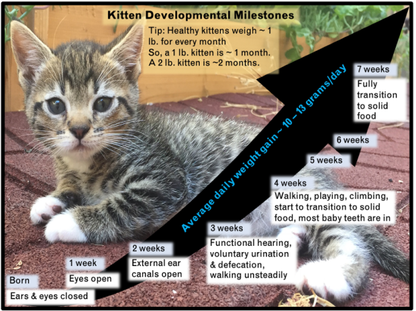 3. Help for the appropriate st(age) of a kitten – Depending on the age of the kitten will determine what type of care the kitten will need. If you are given a 4-day-old kitten, the care involved is significantly different than a 4-week-old or 8-week-old kitten. If unsure, reach out to the shelter/rescue facility for help. Check out the kitten developmental milestones below for a general idea of what to expect with kittens from newborn until almost 2 months of age.