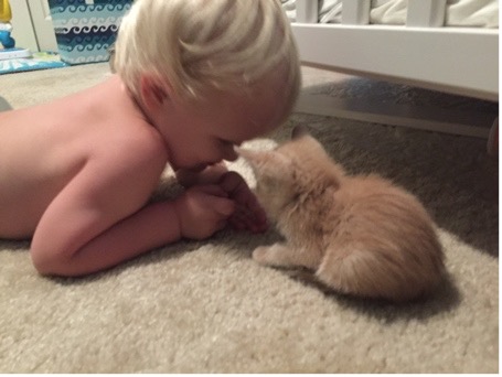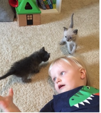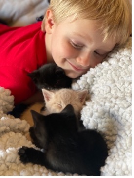 6. Socialization … aka cuddles & handling – This is incredibly important to ensuring kittens grow up to be well-adjusted, lovely cats. It is important that you spend time cuddling, petting, and talking to the kittens gently as well as gradually introducing them to different sounds, smells, and people of different ages, if possible, so they can be comfortable in the future. If socializing kittens with young children, be sure to be there to supervise as young kids can often play a bit harder than they should, as can kittens, and sometimes adults need to step in before inappropriate play escalates.