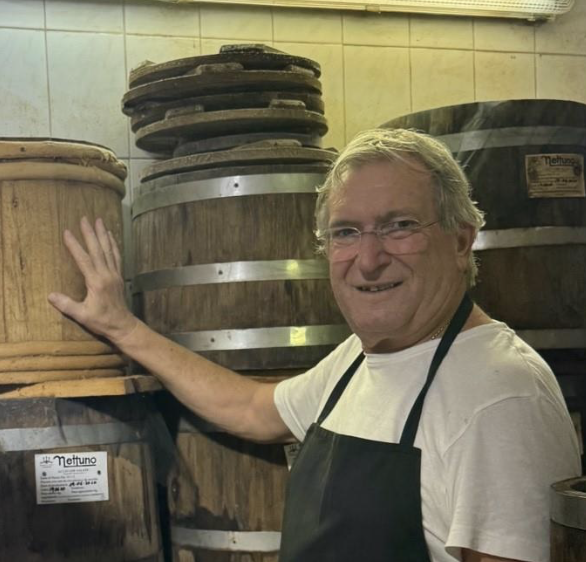 In Cetara, I visited Nettuno, a world-renowned, family-owned producer of anchovies and traditional anchovy sauce. Owner Giulio walked me through the meticulous, step-by-step process of sauce production—a recipe his family has perfected over generations. The process to make the Nettuno anchovy sauces takes multiple years and the price reflects this value at $8.71/ounce. While visiting with Giulio, one of the most significant moments came as he proudly stood beside an old wooden barrel once used by his grandfather more than a century ago. It was a great reminder that for many Italian businesses, products are commercial goods, but also heirlooms of tradition, craftsmanship, and pride.