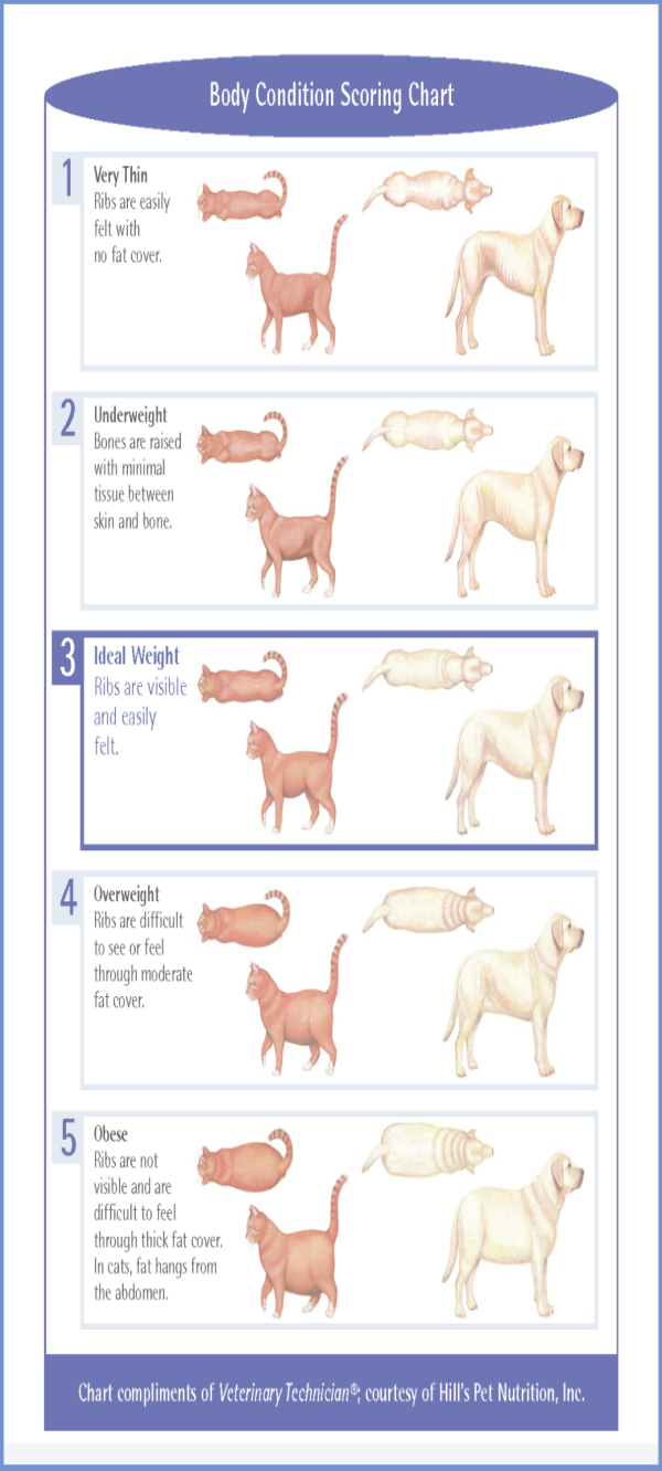 A Body Condition Score (BCS) is a standardized, visual, and tactile assessment used by veterinary professionals and pet parents alike to evaluate a pet’s body condition and fat and nutritional status—to an extent. Body Condition Scoring charts come in two different scales: a 1-9 scale, with 1 being emaciated and 9 being obese (5 out of 9 is ideal weight); and a 1-5 scale, with 1 being emaciated and 5 being obese (3 out of 5 is ideal weight).
