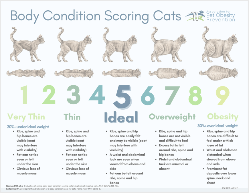 Additionally, a muscle conditioning score can help evaluate muscle mass. This is like the direct assessment veterinary version of the human Body Mass Index (BMI), which is an indirect assessment. Body Condition Scores are arguably more accurate because they account for body composition (to a degree) and, as mentioned previously, breed and body type can affect the interpretation of results, unlike a weight-to-height ratio like BMI. Charts from reputable veterinary sources (e.g., WSAVA or APOP) are great visual tools.