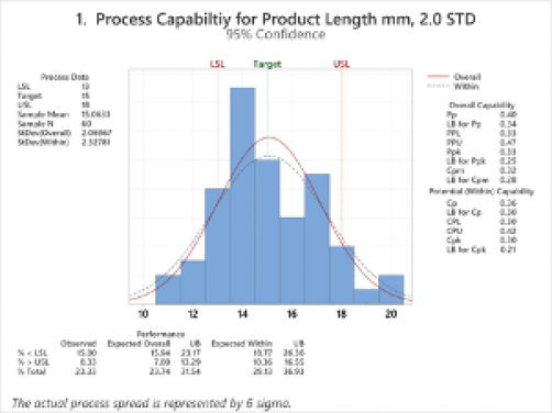 Just to illustrate the value of using Cpk analysis, I put together some fictitious sample data using Minitab and then performed process Capability Analysis (Normal), where the sample number was 60 random points; one dataset with 1.0 standard deviation of variance and 1 dataset with 2.0 standard deviation of variance. The data represents product length, and the ideal piece length is 15 mm, however, the specification calls for 13mm to 18mm. Consider the two graphs below, and let’s see how they differ to point out process variation.