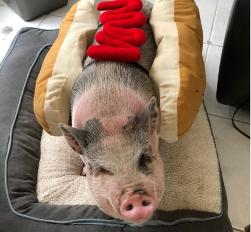 “Dolly dressed up as a hot dog (beef of course)”
